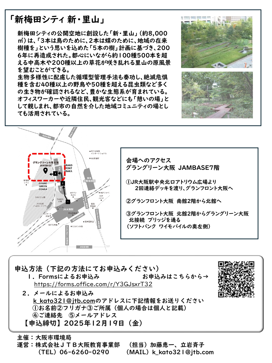 第2回では、2023年前期に「自然共生サイト」として認定された「新梅田シティ新・里山」を見学し、都市部における生物多様性保全の事例を学びます。本見学会を通じて、「都市における緑の役割」や「私たち一人ひとりにできること」について考えていきます。