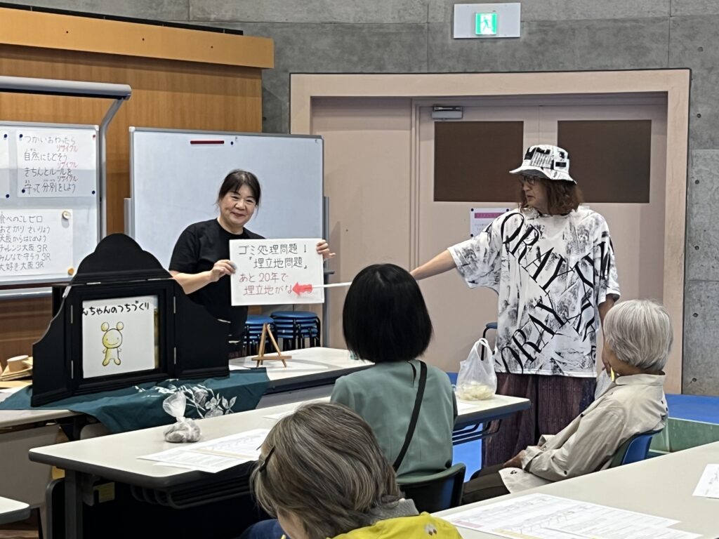 講座の冒頭では、大阪市内で家庭から排出される生ごみの現状について知り、その削減策としてダンボールコンポストが紹介されました。途中、加藤元樹さん・薫さんによる紙芝居で、微生物が生ごみを分解して堆肥に変えていく仕組みを楽しく学びました。