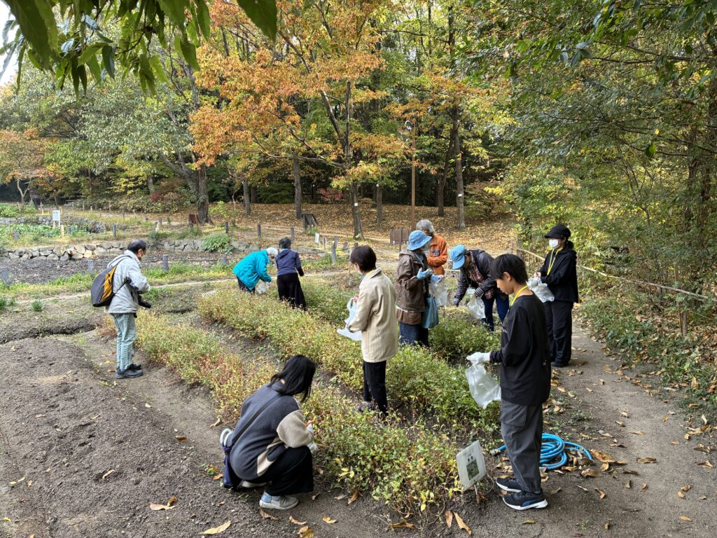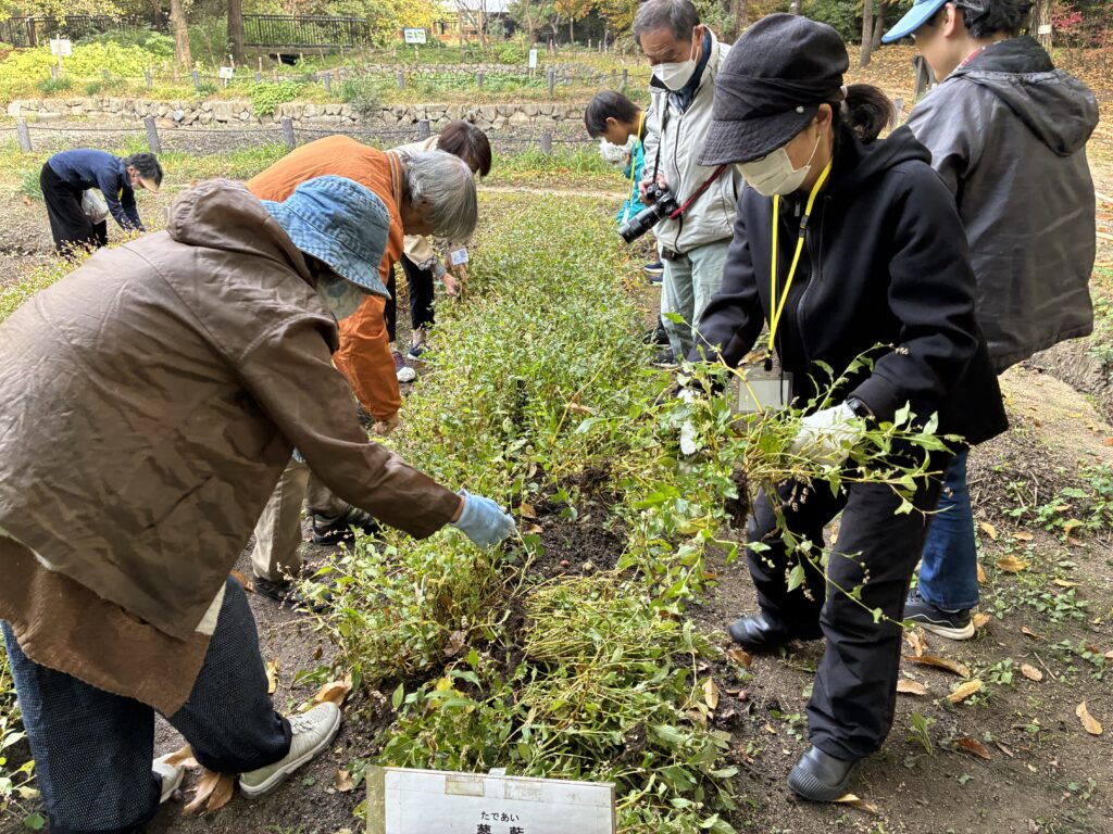 エコボラの渡辺様から今日の講座のスケジュールと内容の説明があった後、まずは自然体験観察園に出て、蓼藍の穂苅を行った。