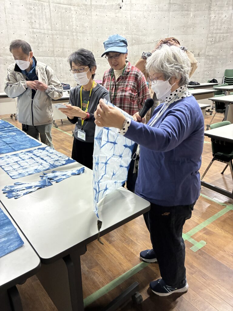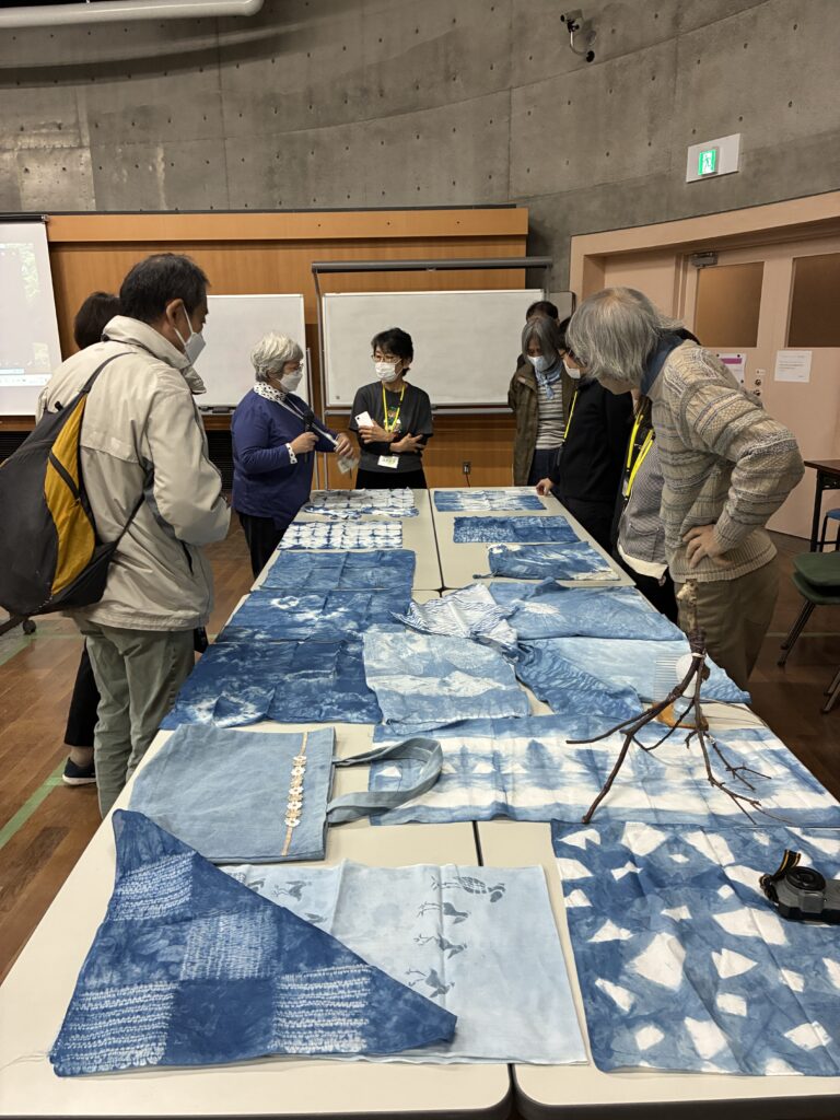 いよいよ前回の藍染体験で各自が作った作品の発表会を実施しました。各人が持ち寄った藍染作品を、どうやって染めたかを中心に、作品のポイントを説明していきました。個性豊かな作品が集まりました。