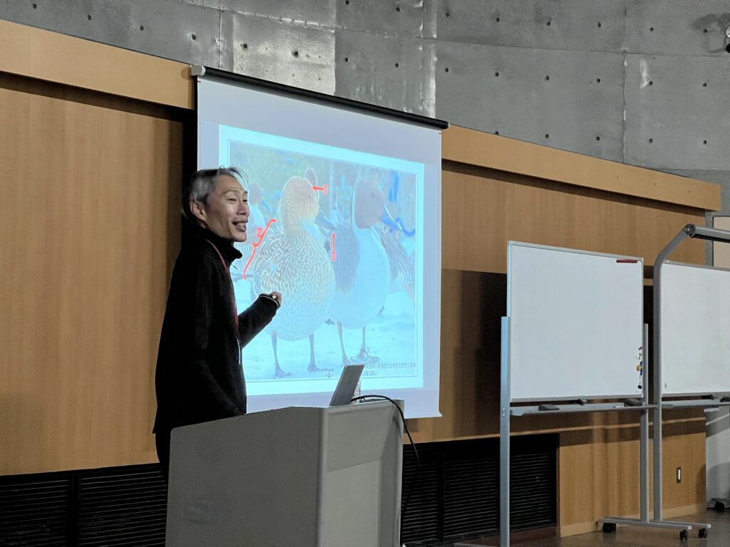 最初の40分ほどは研修室にての事前講義を行いました。今回は水辺にすむ「オナガガモ」をクローズアップし、その生態や雄雌の見分け方などを解説。