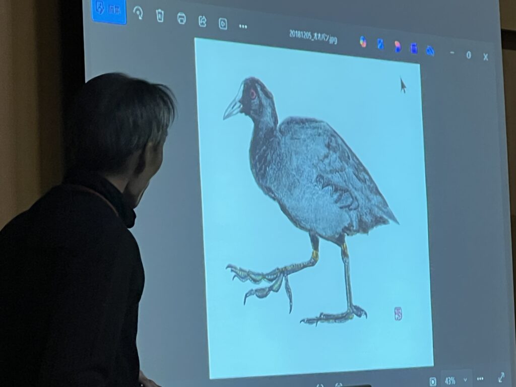 また、今日鶴見緑地で観察できそうな野鳥を、先生が2時間で書き上げるという野鳥のデッサンを見せながら紹介しました。